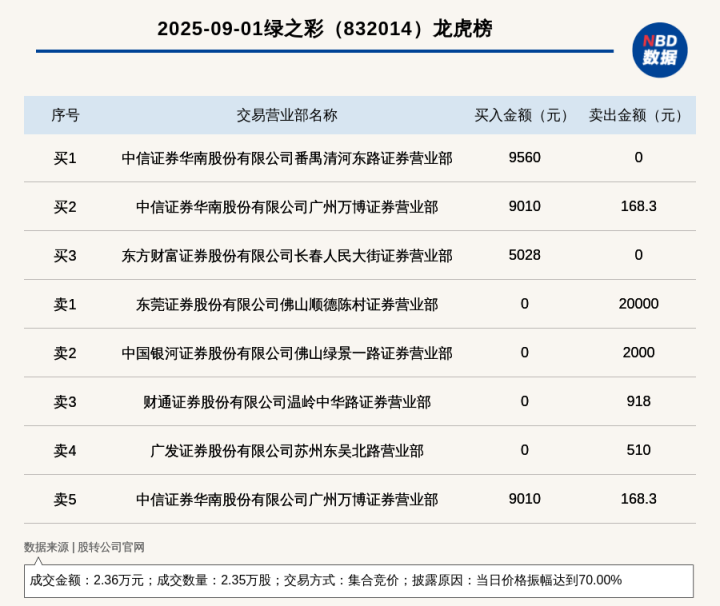 每经讯,2025年9月1日,新三板创新层公司绿之彩(832014,收盘价:1.7元)登上龙虎榜,交易方式是集合竞价,披露原因是当日价格振幅达到70.00%,成交数量2.35万股,成交金额2.36万元。买一席位为中信证券华南股份有限公司番禺清河东路证券营业部,买入9560元;卖一席位为东莞证券股份有限公司佛山顺德陈村证券营业部,卖出2万元。