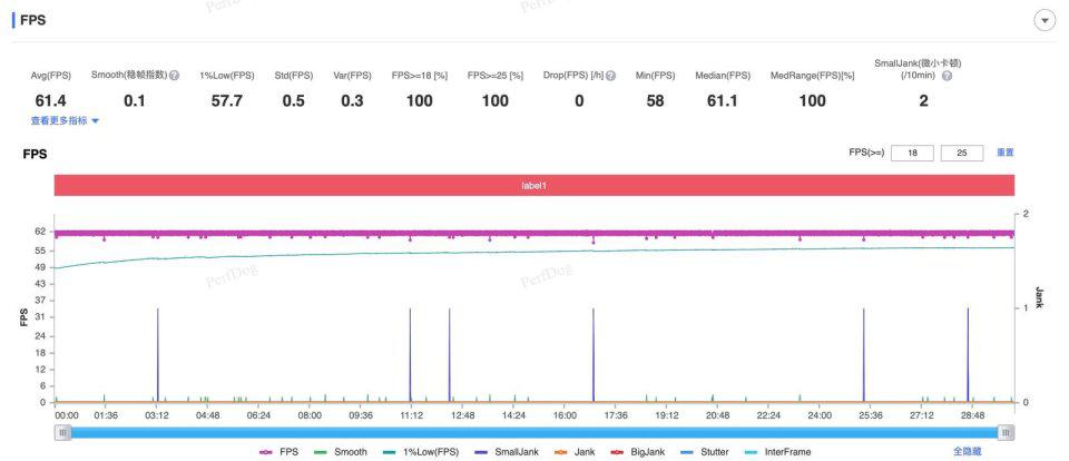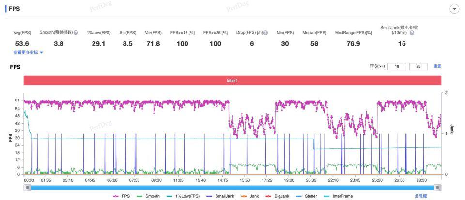 再来看看《星穹铁道》的表现,将画质调整为非常高,帧率为 60 帧,半小时黄金的时刻平均帧率 53.6 帧。虽然在 14 分钟时帧率会有下降,但考虑到目前还有很多机型都无法保证在 972P 的分辨率下能长时间保持稳定帧率,因此 iQOO Z10 Turbo+ 也算是正常发挥了。